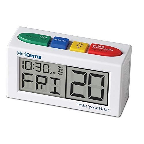 Talking Alarm Clock &ldquoTake your Pills&rdquo talking alarm clock alerts users when it's time to take their medication with a friendly female voice four times a day. Alarm sounds periodically until special &lsquoalarm acknowledged' button is pressed. Loud and Extra Loud Settings. Large-type display is easy to ready. Backlit display for nighttime viewing. 5"L x 1-3/4"W x 2-3/4"H. 1lb.