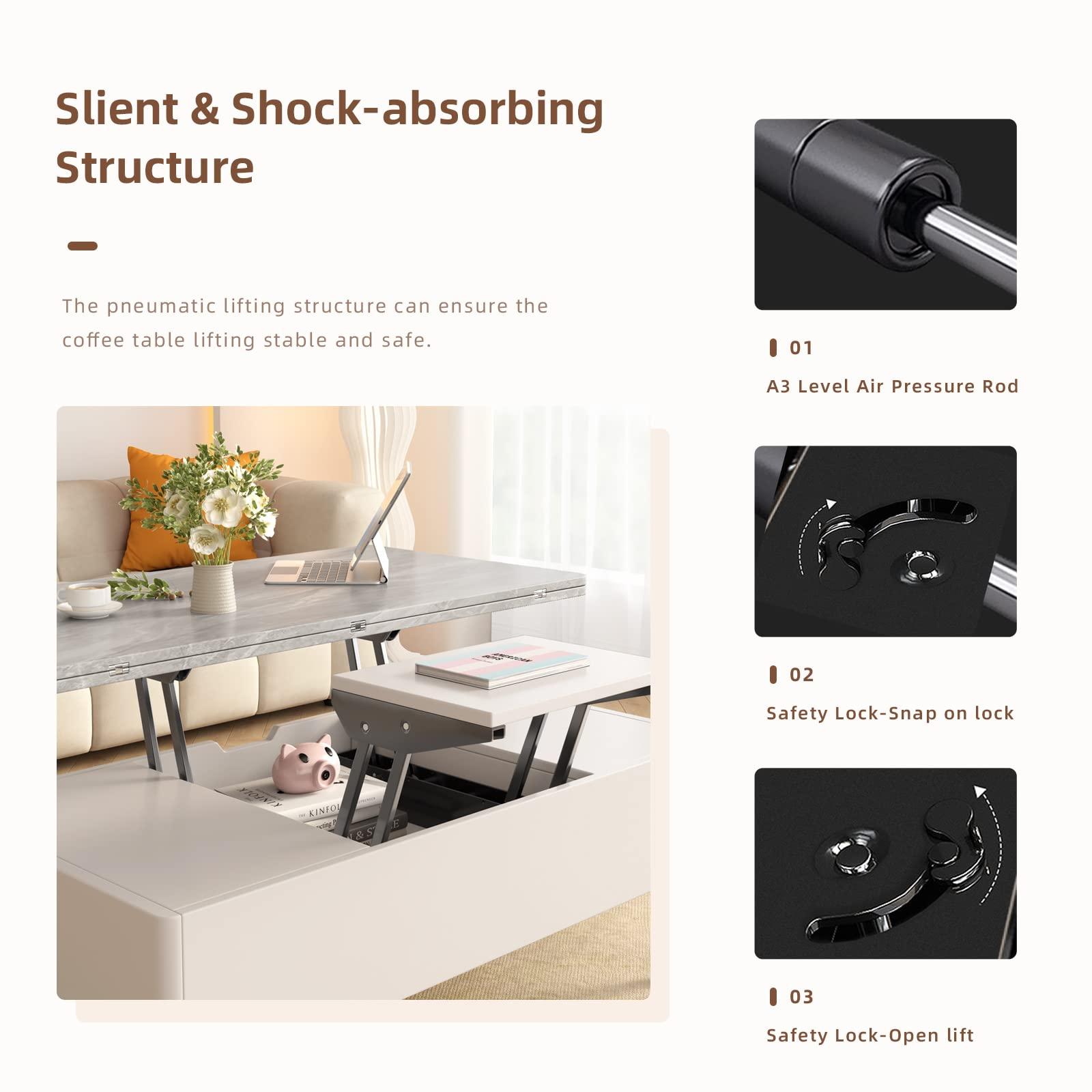 - Lift Top Design: When opened, the coffee table is automatically raised by a hydraulic rod, providing easy access to the interior storage room. The lift top also includes a cushioning mechanism that ensures a smooth and safe closing process when lowering the table top. Not only does this prevent damage to the table, but it also reduces the risk of accidents or injuries. It is both safe and easy to use