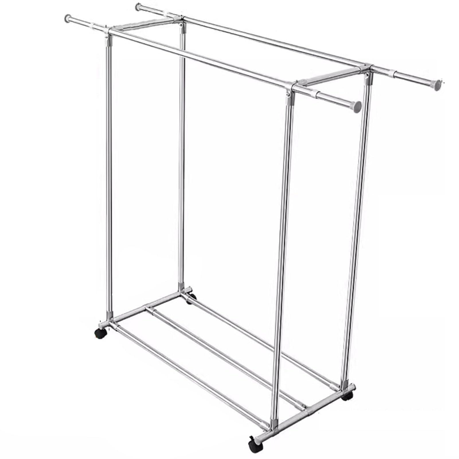 - Double Rod Design: Double hanging rods provide 2-time hanging space,Bottom shelves not only give the clothing rack strength and stability but also provide extra storage space for shoes and bags