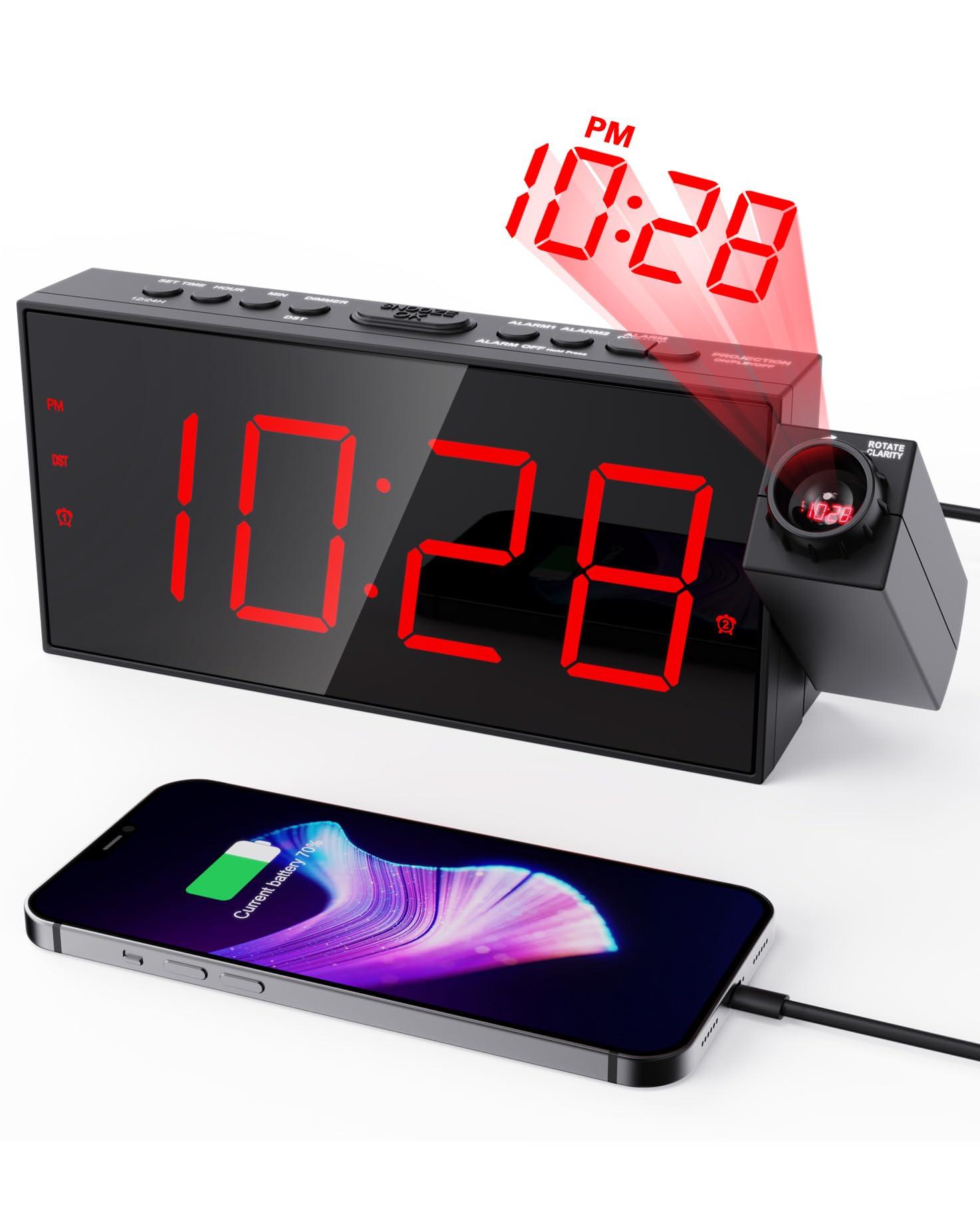 - Ultra-Clear Alarm Clock with Projection on CeilingThis digital projection clock offers ultra-clear views of the time on your ceiling/wall with upgraded adjustable 180 swivel projector, rotating focus ring at the appropriate distance 1.64-11.4ft(0.5-3 meters) to get the fine and smooth time figure image on the wall or ceiling. Easy to grasp the time while in your bed without touching anything.